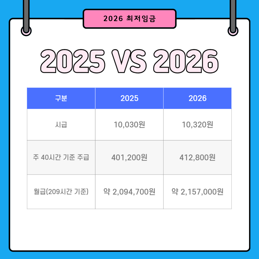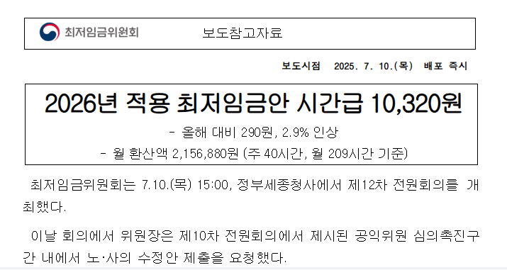 2026년 최저임금이 올해보다 2.9% 오른 시간당 10,320원으로 결정되었습니다.